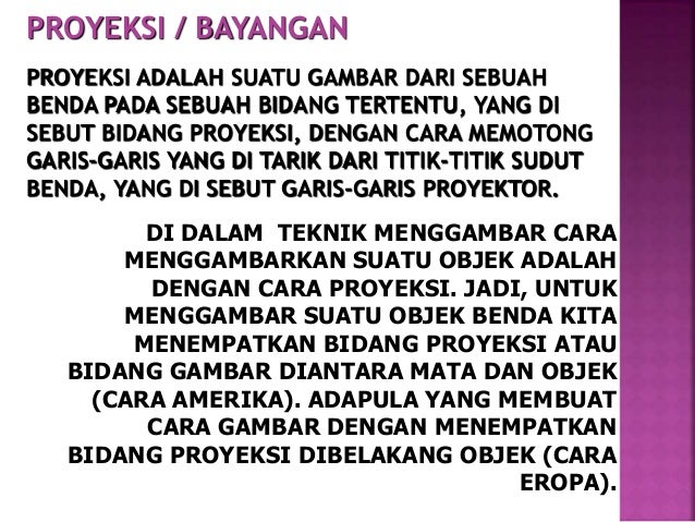 03 02 2022 · Pengertian Gambar Proyeksi Gambar proyeksi adalah suatu gambar bayangan bayangan dari sebuah benda nyata atau imajiner yang di sajikan dalam bentuk gambar menurut aturan aturan tertentu Bila sebuah benda dilihat dari berbagai sisi kanan kiri atas bawah maka benda tersebut akan memiliki berbagai macam bentuk bayangan yang berbeda beda Gambar tampak sisi inilah yang